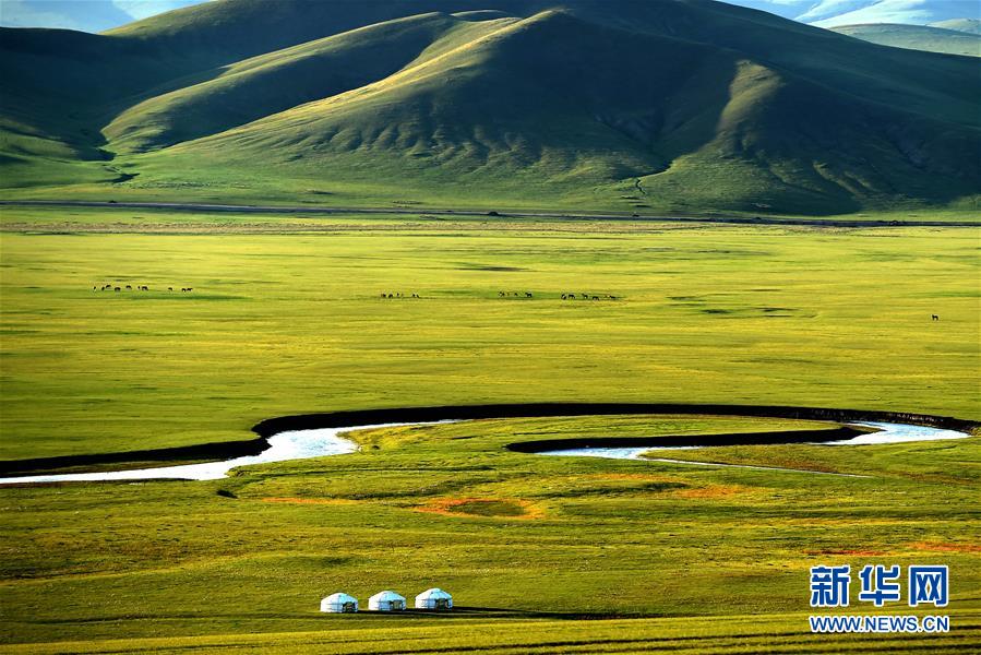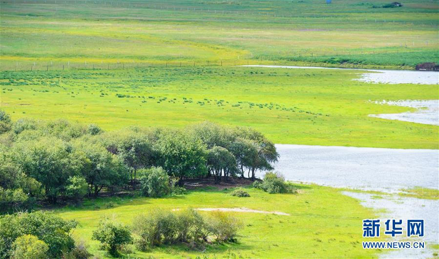 8月29日無人機拍攝的內(nèi)蒙古呼倫貝爾市陳巴爾虎旗境內(nèi)的莫日格勒河與羊群。新華社記者李京攝