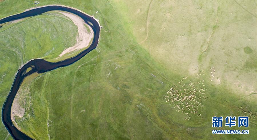 8月29日無人機(jī)拍攝的內(nèi)蒙古呼倫貝爾市陳巴爾虎旗境內(nèi)的莫日格勒河與羊群。新華社記者李京攝