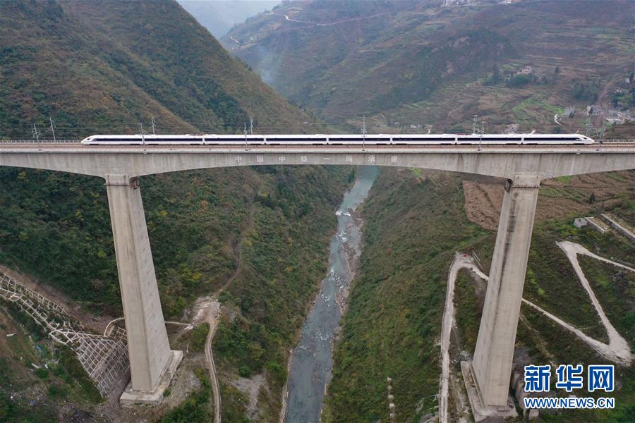 一輛成貴高鐵測試列車駛過香壩河特大橋(12月3日無人機(jī)拍攝)。新華社記者劉續(xù)攝