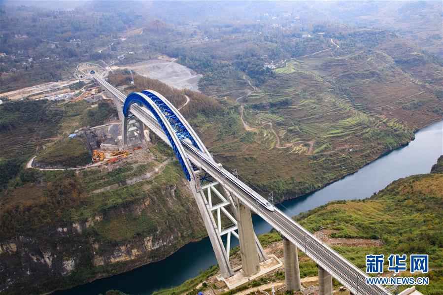 12月2日,一輛試驗列車駛過成貴高鐵鴨池河特大橋。新華社記者劉續(xù)攝