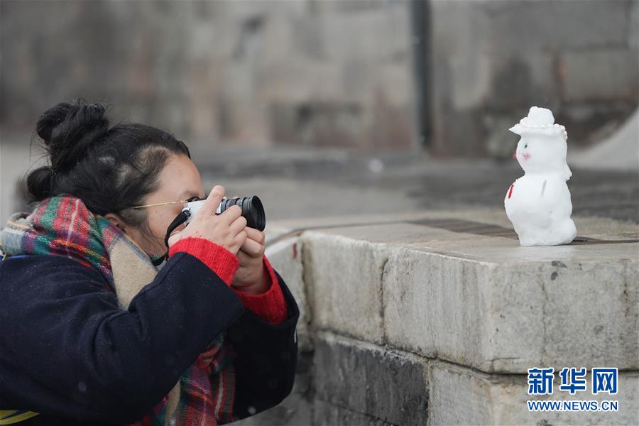 12月16日,在北京天壇公園,一名游客拍攝雪人。當(dāng)日,北京迎來(lái)降雪天氣。新華社記者鞠煥宗攝