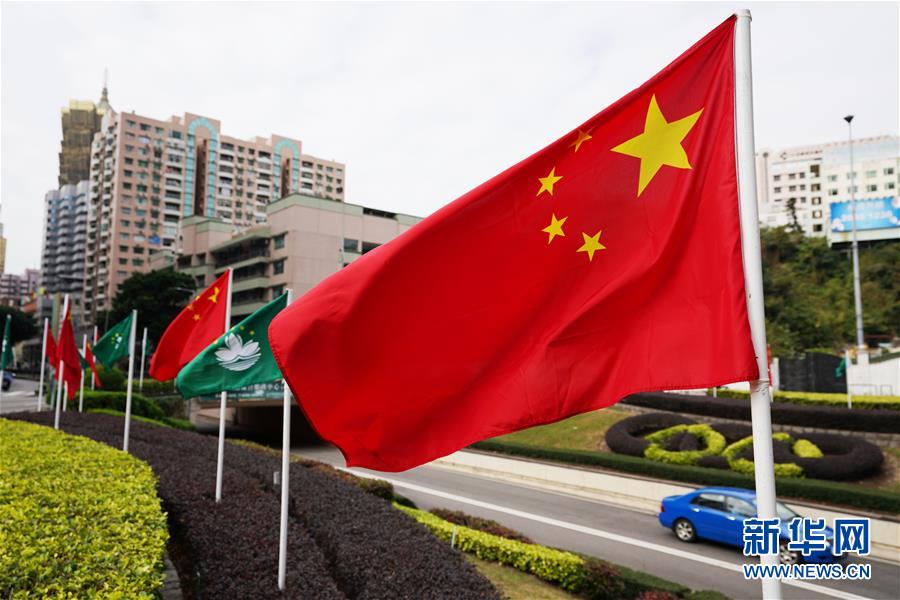 12月17日,在澳門街頭,國(guó)旗和區(qū)旗迎風(fēng)飄揚(yáng)。