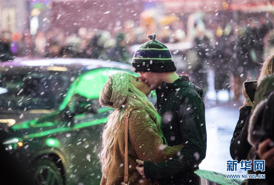 12月18日,在美國紐約時(shí)報(bào)廣場(chǎng),一對(duì)情侶在雪中擁吻。新華社記者 王迎 攝