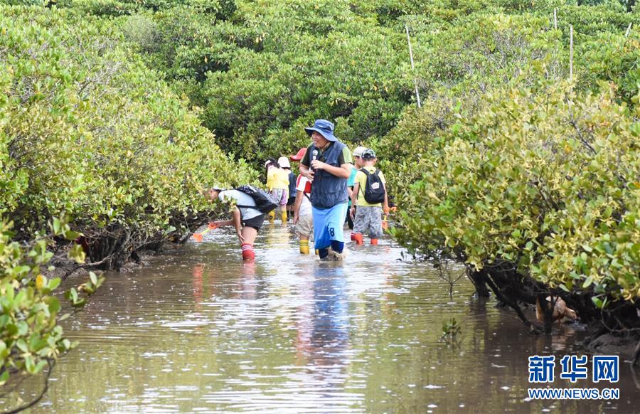 海南東寨港國家級自然保護(hù)區(qū)林業(yè)工程師馮爾輝(前)在保護(hù)區(qū)內(nèi)為學(xué)生進(jìn)行講解(7月16日攝)。 馮爾輝2009年大學(xué)畢業(yè)后來到保護(hù)區(qū)工作,小時(shí)候他家就住在紅樹林邊上,他從小和紅樹林打交道,喜歡動(dòng)植物和鳥類。外貿(mào)專業(yè)畢業(yè)的他邊工作邊學(xué)習(xí),目前主要從事鳥類監(jiān)測、紅樹林保育、自然教育等工作?!凹t樹林看著我長大”,馮爾輝說,濕地保護(hù)的工作非常有意義。 新華社發(fā)