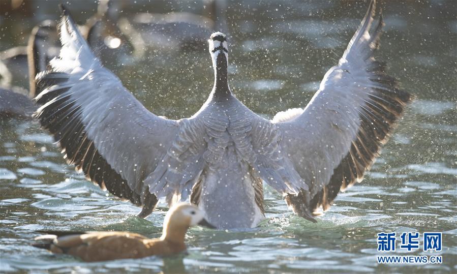 11月21日,候鳥(niǎo)在拉薩龍王潭公園水中嬉戲。新華社記者普布扎西攝