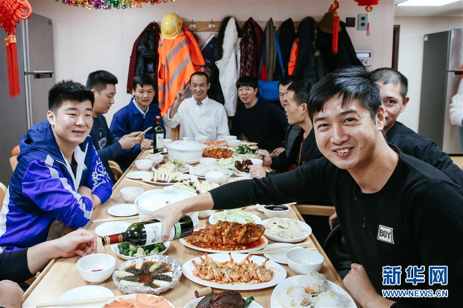 2019年2月5日,在比利時(shí)安特衛(wèi)普港,船員們?cè)凇爸羞h(yuǎn)海運(yùn)天秤座”號(hào)餐廳里共享遲來的年夜飯。由于駛離漢堡港的時(shí)間出現(xiàn)延誤,超大型集裝箱船“中遠(yuǎn)海運(yùn)天秤座”號(hào)在2月5日農(nóng)歷正月初一凌晨?jī)牲c(diǎn)才抵達(dá)安特衛(wèi)普港,遠(yuǎn)洋海員們終于可以開懷暢飲,歡喜過年。 新華社記者 張鋮 攝