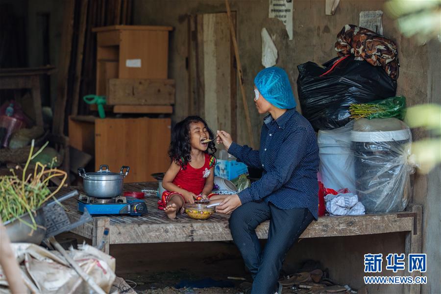 2019年3月15日,在柬埔寨磅湛,接受了白內(nèi)障手術(shù)的孫美樂回到住處給女兒喂飯。今年36歲的孫美樂是一位經(jīng)濟(jì)貧困的單身母親,和小女兒租住在一間簡陋的小屋里。她的左眼因白內(nèi)障幾近失明,無法繼續(xù)工作。在中國醫(yī)生到磅湛開展義診期間,她接受了廣西醫(yī)科大學(xué)第一附屬醫(yī)院梁皓醫(yī)生實施的白內(nèi)障手術(shù),術(shù)后一天她的左眼即恢復(fù)視物。 新華社記者 朱煒 攝