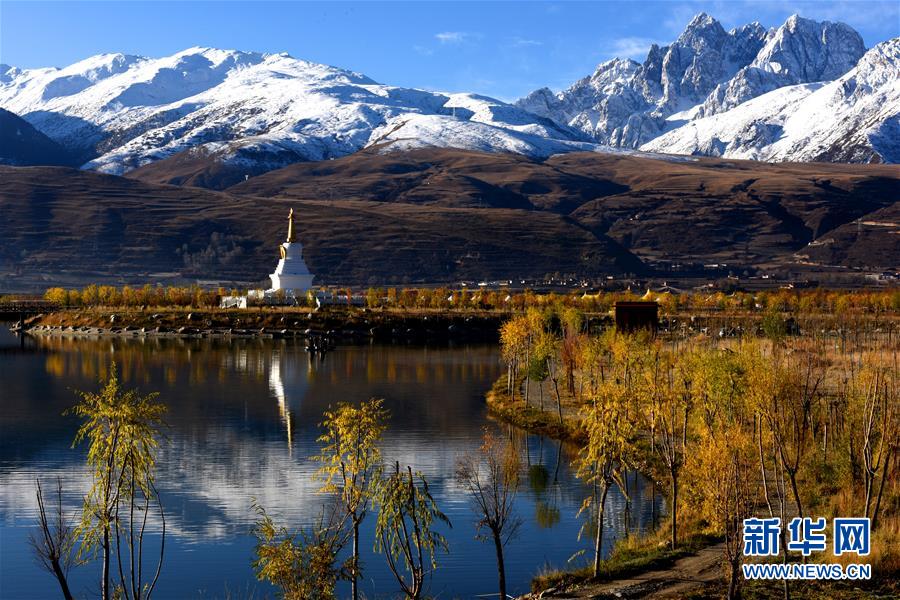 川藏線四川甘孜縣境內的雪山、白塔和民居(11月3日攝)。新華社記者陳天湖攝