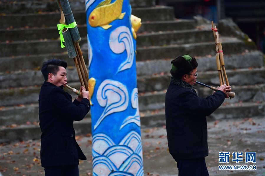 在烏英苗寨新蘆笙柱下,融水苗族自治縣苗族蘆笙音樂代表性傳承人梁安合(右)在練習吹蘆笙(12月24日攝)。新華社記者王諾攝