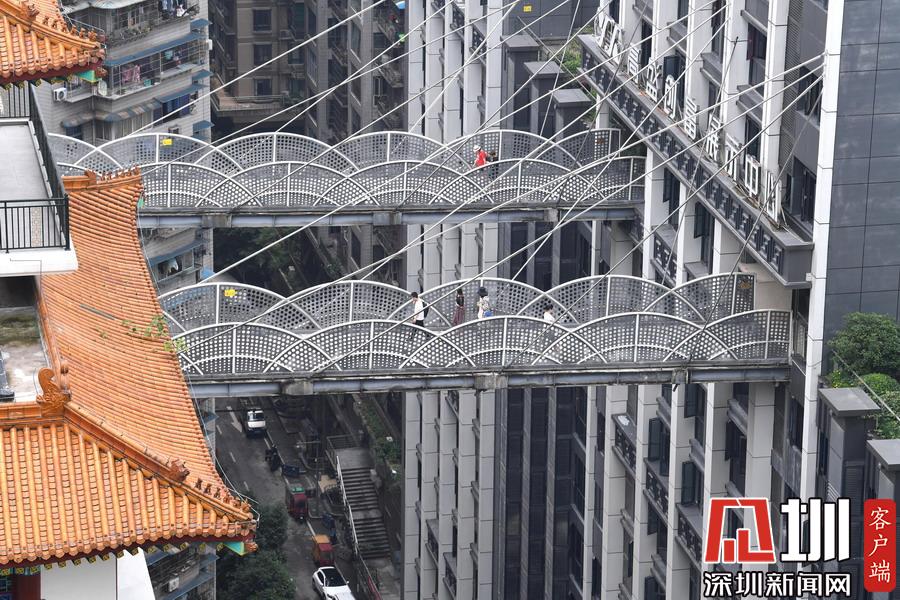 2019年6月12日,重慶臨江門(mén)的高盛創(chuàng)富中心1樓位于嘉陵江濱江路,但如果坐電梯上到27樓,則可以通過(guò)空中廊橋到達(dá)的魁星樓城市休閑廣場(chǎng)以及北區(qū)路。這兩座空中廊橋的不遠(yuǎn)處,可以看到圣地大廈的空中廊橋。