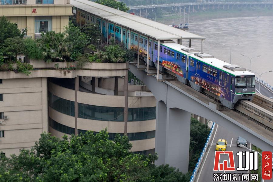 2019年6月25日,重慶渝中區(qū),軌道交通2號線列車從一小區(qū)的6層“螺旋”停車場上方穿過,顯得十分“魔幻”。圖為高處拍攝的軌道交通2號線。