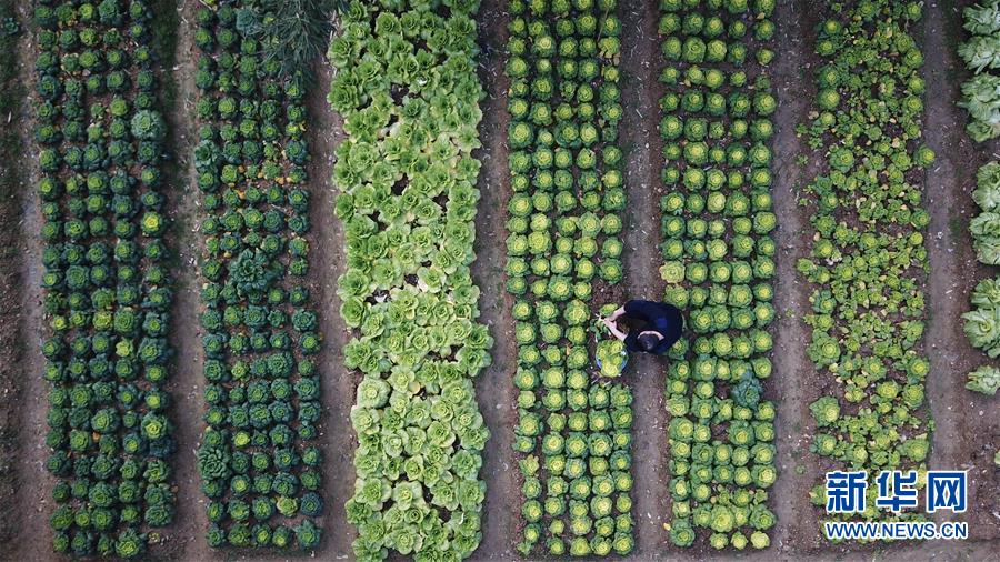 金寨火車站派出所民警呂錦鵬在菜園摘菜(12月19日無人機拍攝)。由于金寨火車站派出所離縣城較遠(yuǎn),平時買菜不方便,民警們在院子里開墾了一處小菜園。新華社記者張端攝