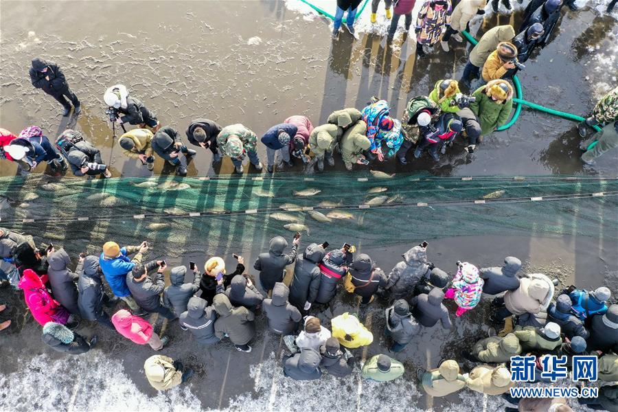 12月18日,人們在諾干湖觀看冬捕活動(無人機(jī)拍攝)。新華社記者劉磊攝