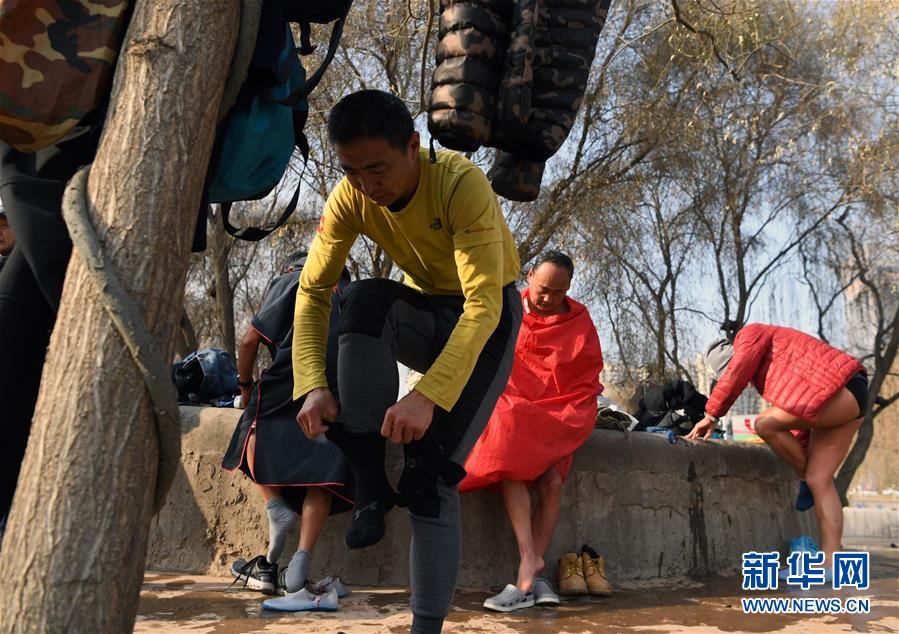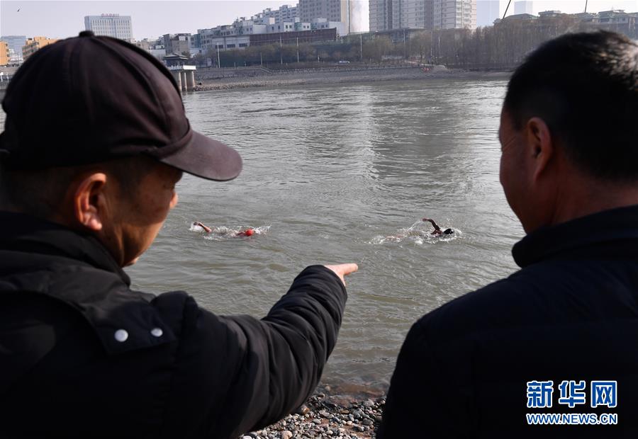 12月19日,在蘭州市馬拉松文化主題公園附近的黃河岸邊,冬泳愛好者入水準備冬泳。新華社記者馬寧攝