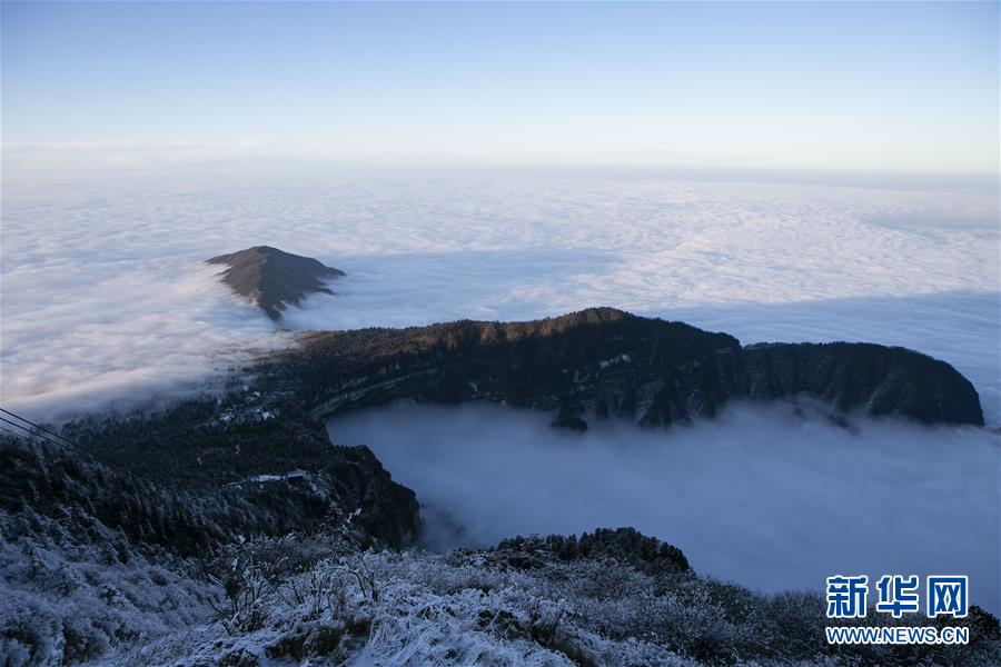 這是12月28日在四川省峨眉山金頂拍攝的景色。時值冬日,峨眉山銀裝素裹、宛如仙境。新華社記者李夢馨攝