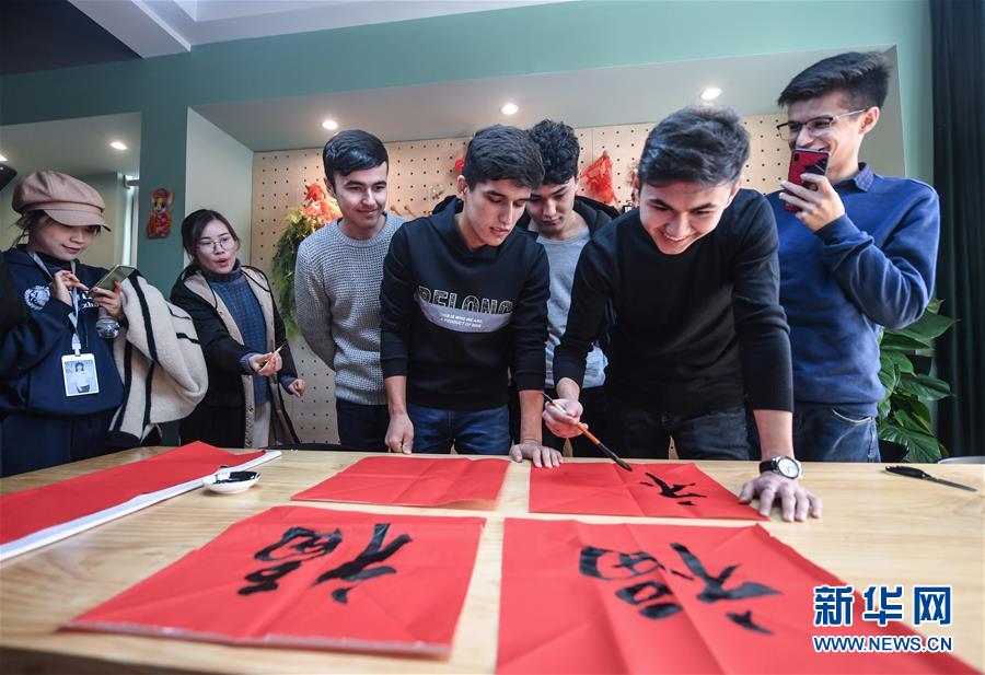 12月27日,外國留學(xué)生在瓜山新苑社區(qū)活動中心參加迎新年活動,學(xué)習(xí)用毛筆寫福字。新華社記者 徐昱 攝