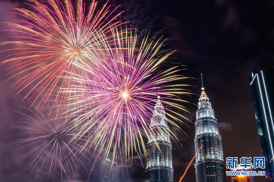 2020年1月1日,焰火在馬來西亞吉隆坡的馬來西亞國家石油公司雙塔旁綻放,迎接新年的到來。新華社記者朱煒攝