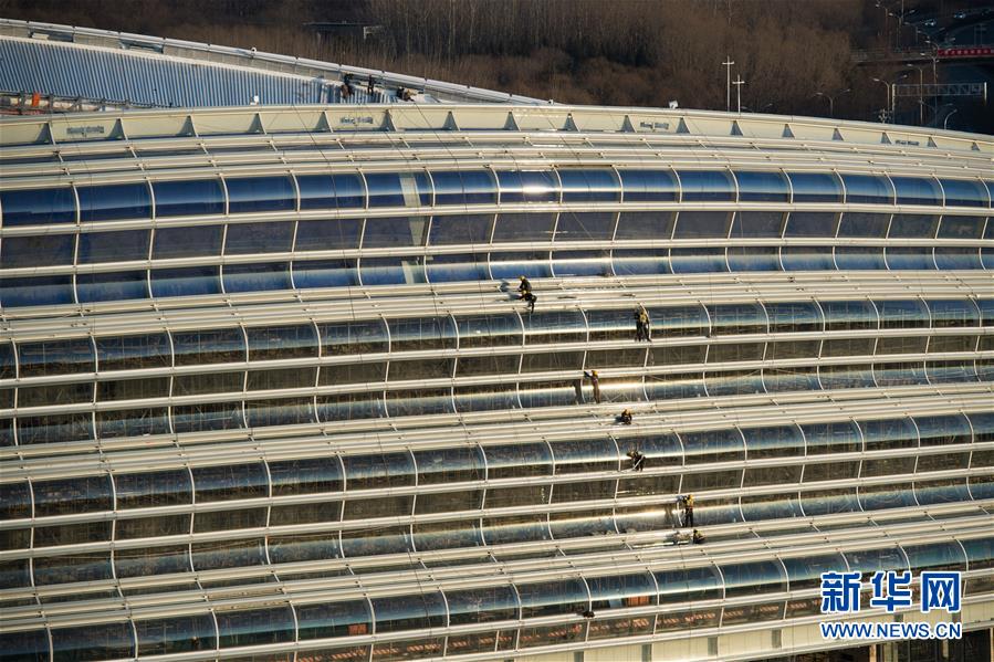 12月31日,施工人員在國家速滑館施工現(xiàn)場安裝最后一塊屋面單元板塊。新華社記者鞠煥宗攝