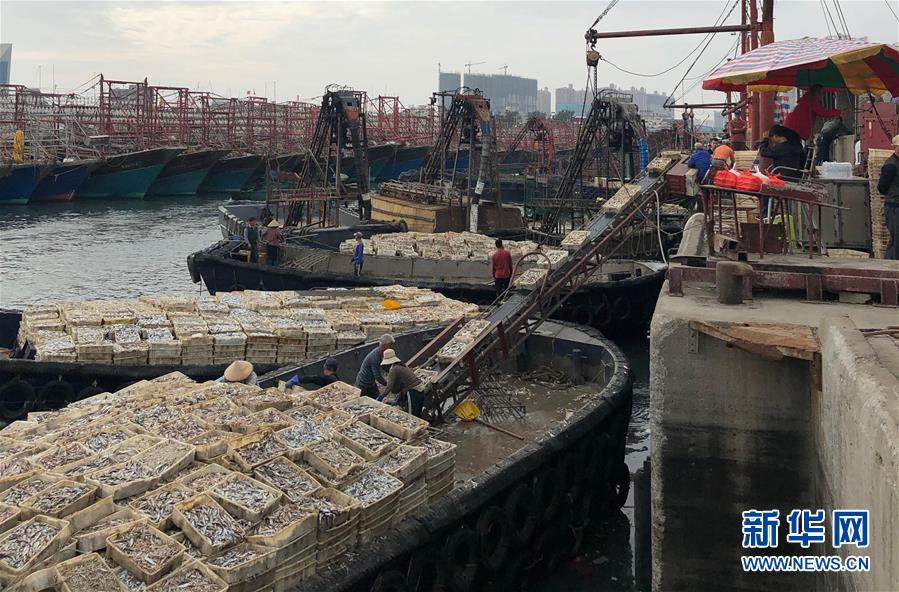 1月1日,滿載歸來(lái)的漁船陸續(xù)駛進(jìn)港灣,工人們?cè)谛遁d漁獲。新華社記者潘強(qiáng)攝
