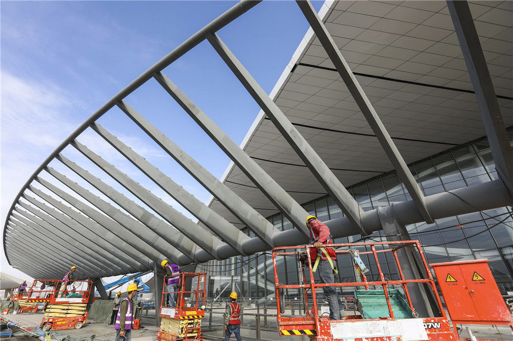 2019年5月24日,北京,新機場建設(shè)距離竣工時間還有37天,工程進入倒計時。機場開建至今不到5年時間,機場施工工程將于6月底竣工,將于9月底投入運營,該機場有望成為世界上規(guī)模最大的機場之一。任振朝/千龍圖像/視覺中國