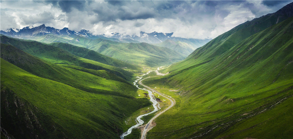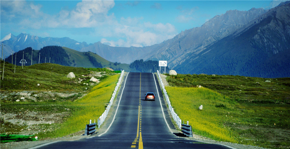 2019年7月10日,新疆獨(dú)庫(kù)公路蜿蜒在天山山脈的草原山谷中。黃光浩/視覺(jué)中國(guó)