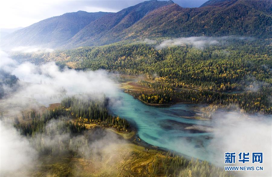 9月25日無(wú)人機(jī)拍攝的喀納斯景區(qū)風(fēng)光。新華社記者王菲攝