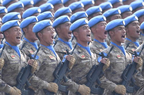2019年10月1日,慶祝中華人民共和國(guó)成立70周年大會(huì)在北京天安門廣場(chǎng)隆重舉行。這是維和部隊(duì)方隊(duì)接受檢閱。新華社記者劉大偉攝