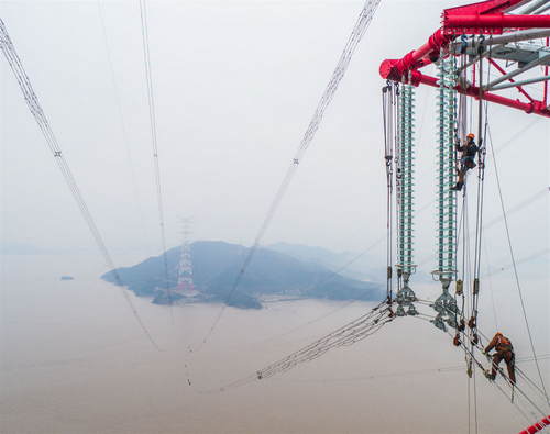 2019年1月3日,施工人員在浙江省舟山500千伏聯(lián)網(wǎng)輸變電工程380米跨海輸電鐵塔上進(jìn)行驗收和消缺作業(yè)(無人機(jī)照片)。新華社記者徐昱攝