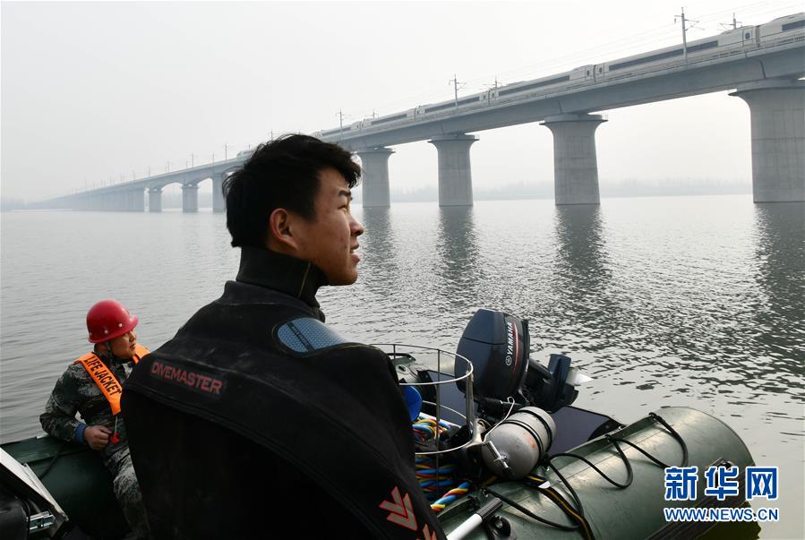 1月3日,潛水員李壯看著飛馳而過(guò)的列車(chē)準(zhǔn)備潛水檢查橋墩。新華社記者 朱崢攝