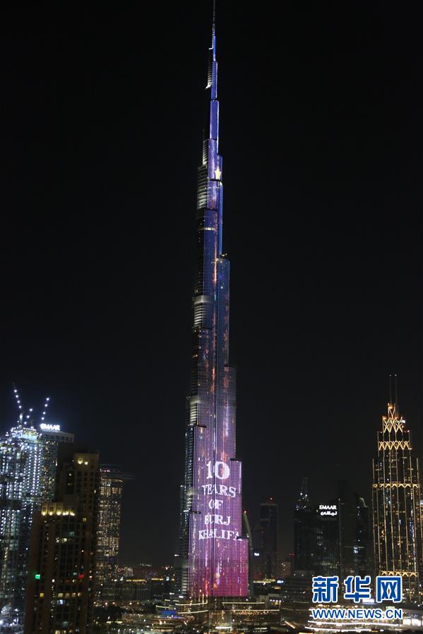 這是1月4日在阿聯(lián)酋迪拜拍攝的世界第一高樓哈利法塔慶祝開(kāi)放10周年燈光秀。