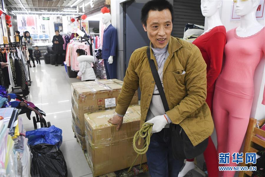 冉光輝在重慶朝天門大正商場(chǎng)內(nèi)整理即將搬運(yùn)的貨物(1月5日攝)。新華社記者王全超攝
