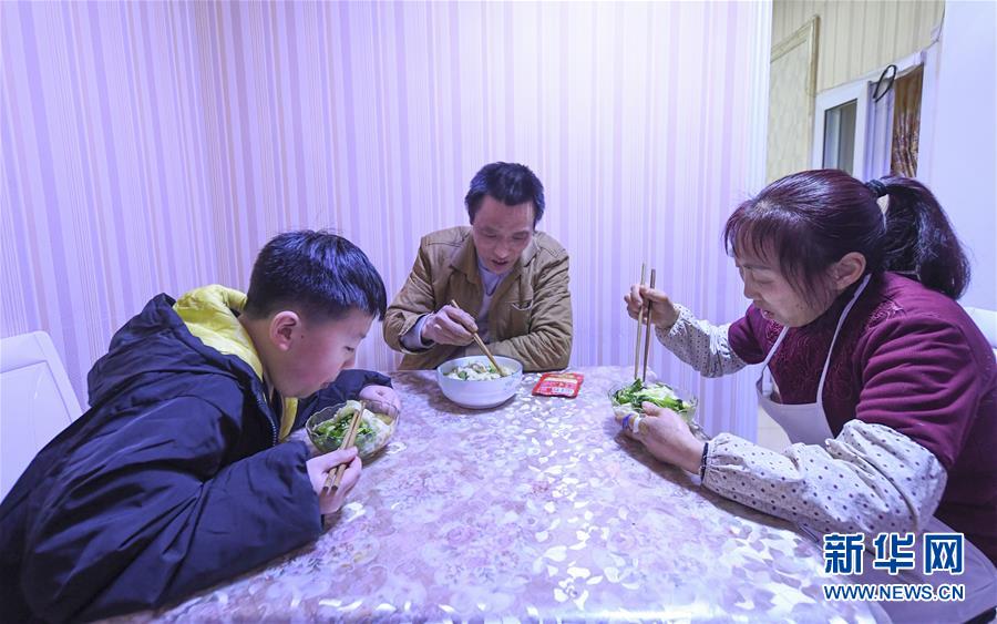 冉光輝和妻子瞿光芳、兒子冉俊超在家里吃晚飯(1月5日攝)。新華社記者王全超攝