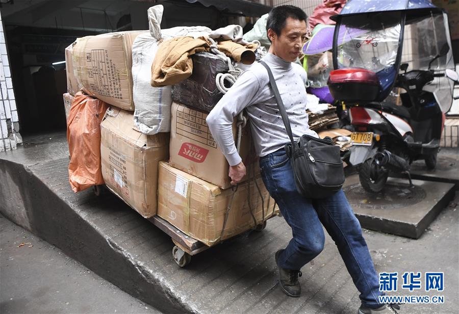 冉光輝用小板車載著貨物,從重慶朝天門大生商場出發(fā),前往發(fā)貨地點(1月5日攝)。新華社記者王全超攝