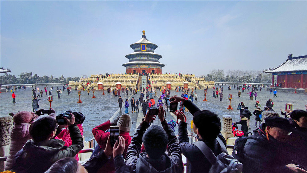 2019年11月30日,北京,天壇公園里觀雪賞景的市民絡(luò)繹不絕。喬?。垐D像/視覺中國