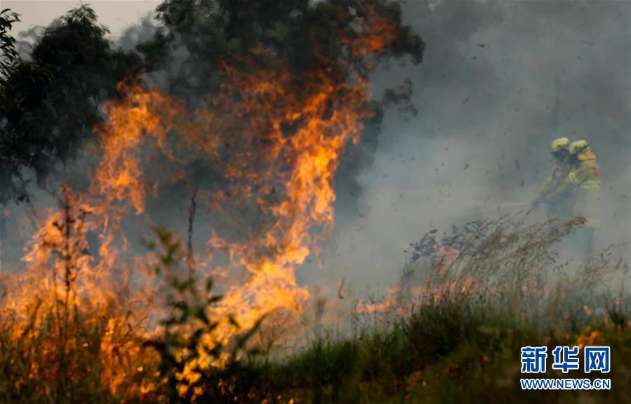 2019年11月11日,在澳大利亞新南威爾士州塔里附近的山地,消防員在撲滅山火。新華社記者白雪飛攝