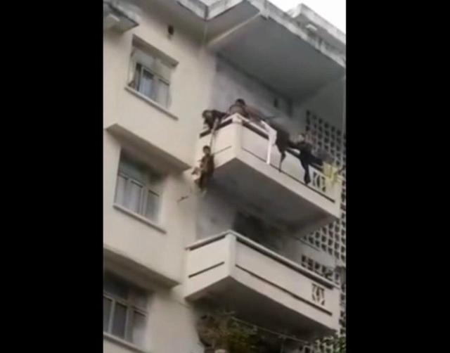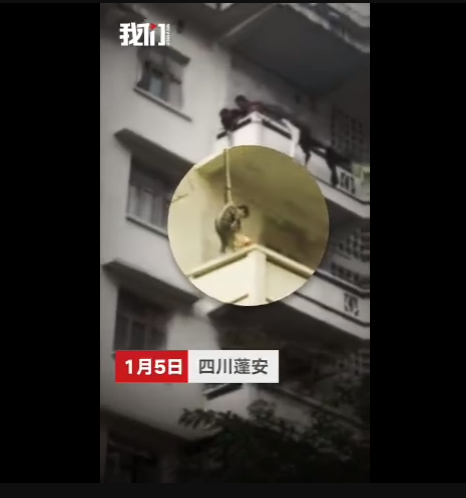 一只貓跑到了百順街老百貨公司宿舍樓三樓的窗戶遮雨臺(tái)上,被5樓的老太太發(fā)現(xiàn),老太太善心發(fā)作,竟將孫子用繩子吊起,從5樓慢慢放至3樓救貓,整個(gè)過(guò)程不禁令人捏汗。