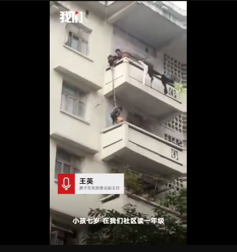 小男孩被大人們用繩子系著腰,晃晃悠悠地吊下三樓遮雨平臺(tái)后,勇敢地走向貓,將其抱起,接著又被5樓的奶奶等人晃晃悠悠地吊起往上拉,小男孩全程表情木然,絲毫未見(jiàn)緊張害怕。萬(wàn)幸的是,最終男孩平安并順利完成任務(wù)。