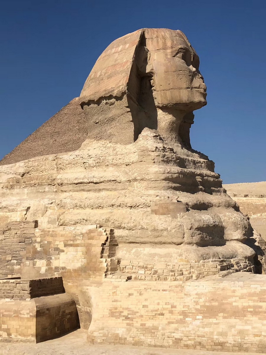 此像高20米,長(zhǎng)57米,算上兩個(gè)前爪,全長(zhǎng)72米。它頭戴“奈姆斯”皇冠,兩耳側(cè)有扇狀的“那姆斯”頭巾下垂,前額上刻著圣蛇浮雕,下頜有帝王的標(biāo)志,下垂的長(zhǎng)須,脖子上圍著項(xiàng)圈,鷹的羽毛圖案打扮著獅身。孫衛(wèi)南攝