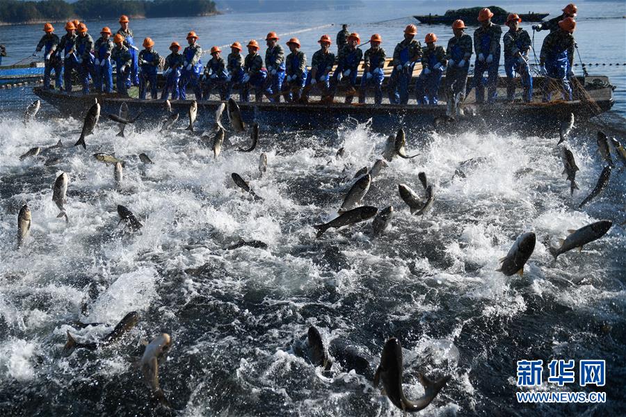 11月28日,捕撈隊(duì)員在千島湖進(jìn)行巨網(wǎng)捕魚(yú),群魚(yú)躍出水面。