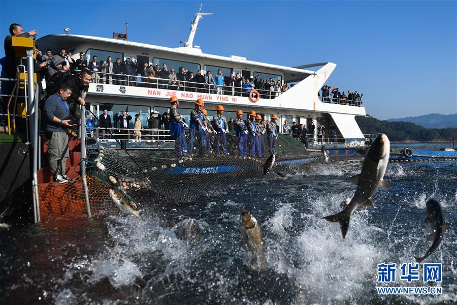 當(dāng)日,浙江省杭州市淳安縣千島湖中心湖區(qū)上演巨網(wǎng)捕魚(yú),30余名捕撈隊(duì)員經(jīng)過(guò)半個(gè)多小時(shí)拉網(wǎng),獲得大豐收。