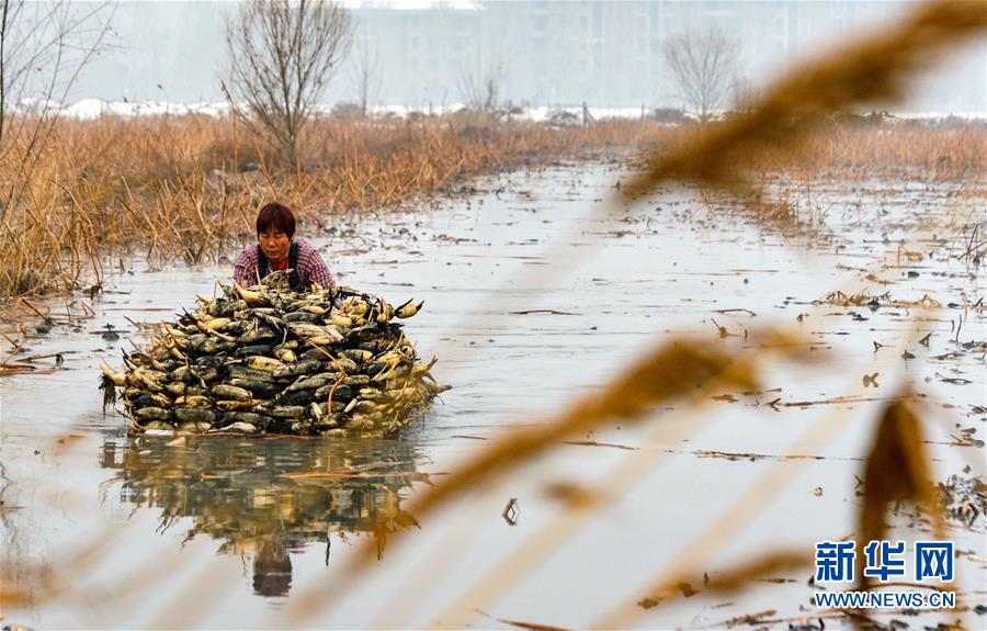 1月10日,村民在磁縣禾下土白蓮藕立體種養(yǎng)基地采收蓮藕。 新華社記者 王曉 攝
