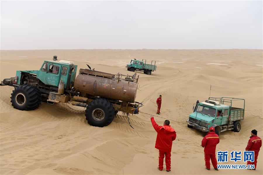 一輛測量作業(yè)車陷在沙坑中,水罐車進行營救(1月13日攝)。地球物理勘探是油氣開發(fā)的第一步,相當于給地球做CT。物探工人按照嚴格的測線部署,在相應位置鉆井,然后實施地震,采集地震波數(shù)據(jù)??蒲腥藛T通過數(shù)據(jù)組成的“CT片”,就能夠清晰地“看”到地下的地質(zhì)結(jié)構(gòu),判斷哪里埋藏有石油或者天然氣。2019年10月,東方地球物理勘探有限責任公司塔里木物探處2113隊進入新疆塔克拉瑪干沙漠腹地,開始中古14-21、塔中2兩個區(qū)塊的三維地震勘探。近2000名物探工人將在1000平方公里的范圍內(nèi)一直工作到2020年4月,這也意味著他們將在塔克拉瑪干沙漠腹地連續(xù)度過第14個除夕夜。蘊藏著豐富石油天然氣資源的新疆塔克拉瑪干沙漠有“死亡之?!敝Q,氣候干燥,年降水量在50毫米以下,冬季地表最低溫度超過零下30攝氏度,是世界油氣勘探難度最大的地區(qū)之一。為避開風季,物探工人每年9、10月份進入沙漠,一直工作到來年4月,夜以繼日與黃沙、嚴寒為伴,用辛勤的汗水,為祖國找油找氣。新華社記者丁磊攝