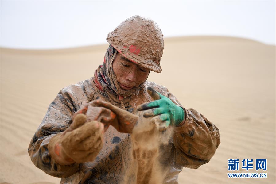 1月13日,鉆井工潘洪星用沙子帶出手套里的泥水。地球物理勘探是油氣開發(fā)的第一步,相當(dāng)于給地球做CT。物探工人按照嚴(yán)格的測(cè)線部署,在相應(yīng)位置鉆井,然后實(shí)施地震,采集地震波數(shù)據(jù)??蒲腥藛T通過數(shù)據(jù)組成的“CT片”,就能夠清晰地“看”到地下的地質(zhì)結(jié)構(gòu),判斷哪里埋藏有石油或者天然氣。2019年10月,東方地球物理勘探有限責(zé)任公司塔里木物探處2113隊(duì)進(jìn)入新疆塔克拉瑪干沙漠腹地,開始中古14-21、塔中2兩個(gè)區(qū)塊的三維地震勘探。近2000名物探工人將在1000平方公里的范圍內(nèi)一直工作到2020年4月,這也意味著他們將在塔克拉瑪干沙漠腹地連續(xù)度過第14個(gè)除夕夜。蘊(yùn)藏著豐富石油天然氣資源的新疆塔克拉瑪干沙漠有“死亡之海”之稱,氣候干燥,年降水量在50毫米以下,冬季地表最低溫度超過零下30攝氏度,是世界油氣勘探難度最大的地區(qū)之一。為避開風(fēng)季,物探工人每年9、10月份進(jìn)入沙漠,一直工作到來年4月,夜以繼日與黃沙、嚴(yán)寒為伴,用辛勤的汗水,為祖國找油找氣。新華社記者丁磊攝