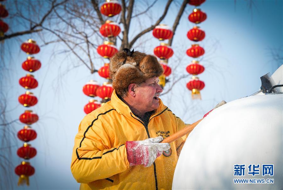1月13日,參賽選手在哈爾濱太陽(yáng)島雪博會(huì)園區(qū)創(chuàng)作雪雕。新華社記者王松攝