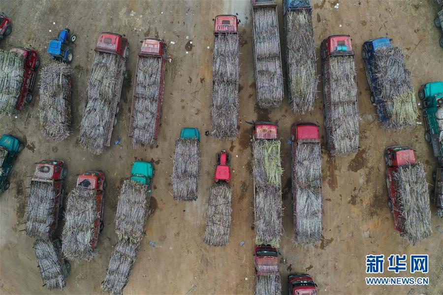 1月13日,運蔗車輛排隊進(jìn)入鹿寨縣一家制糖企業(yè)(無人機(jī)照片)。新華社記者黃孝邦攝