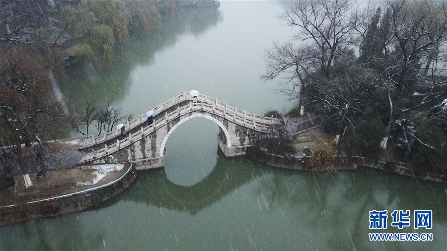 1月15日,幾名游客在雪中的合肥市包公園參觀(無人機照片)。 當日,安徽省合肥市迎來降雪天氣。雪中的合肥市包公園景色別致。 新華社記者 張端 攝