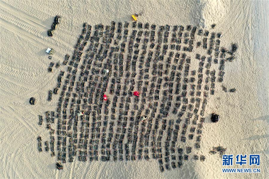 放線女工在塔克拉瑪干沙漠腹地進(jìn)行放線工作(無(wú)人機(jī)照片,1月14日攝)。