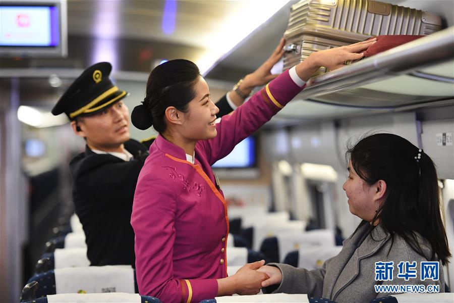 吉如(中)將盲人姑娘吳瀟護(hù)送上車后,為她安放行李(1月15日攝)。新華社記者陶明攝