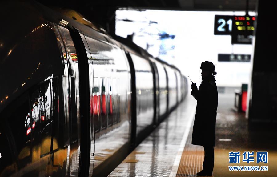 吉如在西安北站站臺(tái)上,與檢票口客運(yùn)人員聯(lián)控(1月14日攝)。今年春運(yùn)列車(chē)開(kāi)行密度大,站臺(tái)崗位人員緊張,吉如時(shí)常被調(diào)到站臺(tái)進(jìn)行站臺(tái)服務(wù)工作。新華社記者陶明攝
