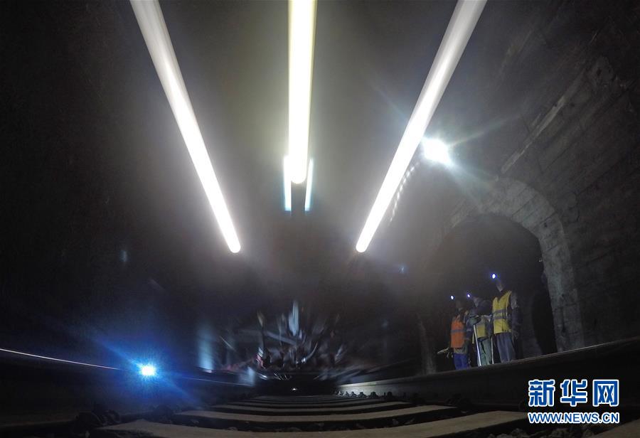 1月9日,在加格達(dá)奇工務(wù)段西羅奇嶺二號(hào)隧道,西羅奇維修工隊(duì)工作人員在避車洞內(nèi)躲避列車。新華社記者王毓國(guó)攝